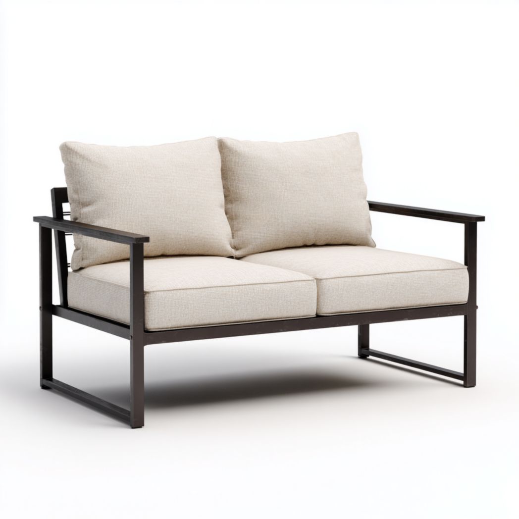 Canapé d’extérieur deux places avec coussins beige et structure marron foncé