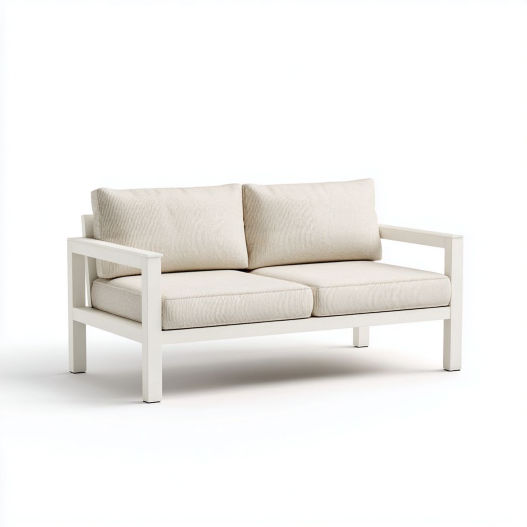 Canapé d’extérieur deux places avec coussins ivoire et structure blanche